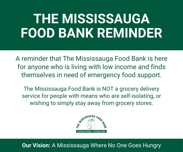 A reminder that The Mississauga Food Bank is here for anyone who is living with low income and finds themselves in need of emergency food support.